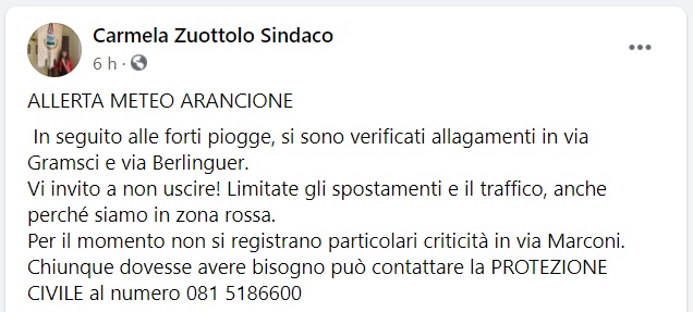 Questo quanto apprendiamo dalla pagina facebook del Sindaco di San Marzano sul Sarno: "ALLERTA METEO ARANCIONE In seguito alle forti piogge, si sono verificati allagamenti in via Gramsci e via Berlinguer. Vi invito a non uscire! Limitate gli spostamenti e il traffico - si legge nella nota -, anche perché siamo in zona rossa. Per il momento non si registrano particolari criticità in via Marconi. Chiunque dovesse avere bisogno può contattare la PROTEZIONE CIVILE al numero 081 5186600.