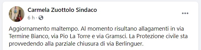 Aggiornamento maltempo. Al momento risultano allagamenti in via Termine Bianco, via Pio La Torre e via Gramsci. La Protezione civile sta provvedendo - si legge nella nota - alla parziale chiusura di via Berlinguer."
