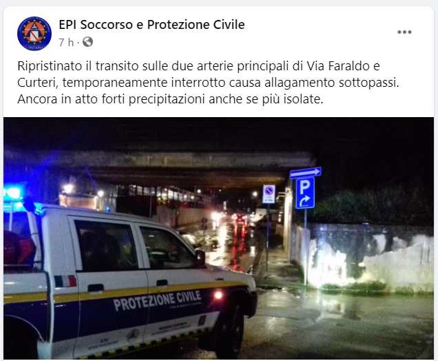 Questo quanto apprendiamo dalla pagina fb della Prot. Civile di Mercato San Severino: "Ripristinato il transito sulle due arterie principali di Via Faraldo e Curteri, temporaneamente interrotto - si legge nella nota - causa allagamento sottopassi. Ancora in atto forti precipitazioni anche se più isolate."