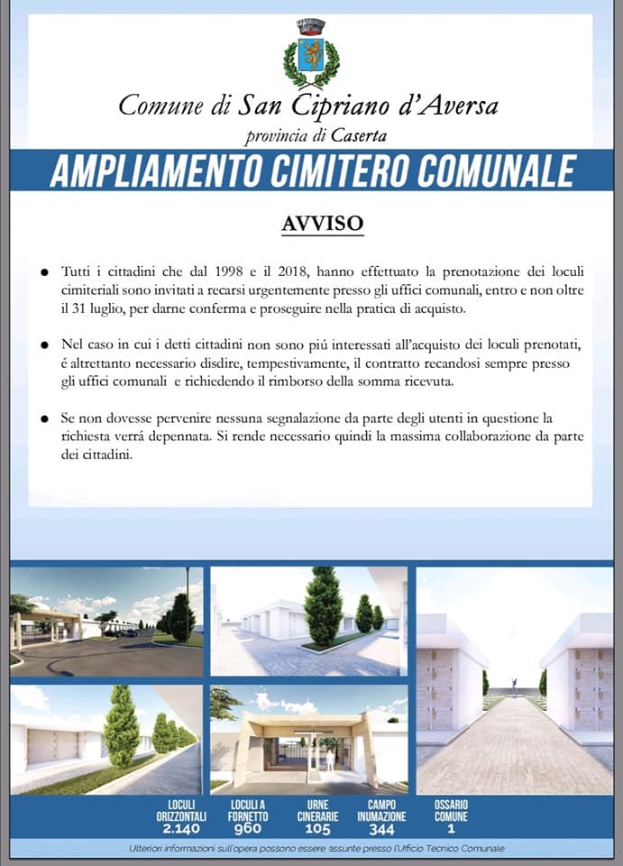 Il Comune di San Cipriano d'Aversa avvisa tutti i cittadini in merito all'ampliamento del cimitero comunale.