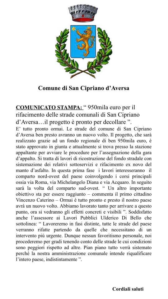 Questa è la nota stampa del Comune di San Cipriano d'Aversa in merito a 950 mila euro di finanziamento per il rifacimento del manto stradale.