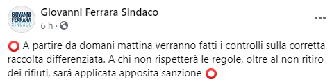 Questo il post pubblicato sulla sua pagina Facebook dal Sindaco di San Felice a Cancello Giovanni Ferrara: "A partire da domani mattina verranno fatti i controlli sulla corretta raccolta differenziata. A chi non rispetterà le regole - si legge nel post - oltre al non ritiro dei rifiuti, sará applicata apposita sanzione".
