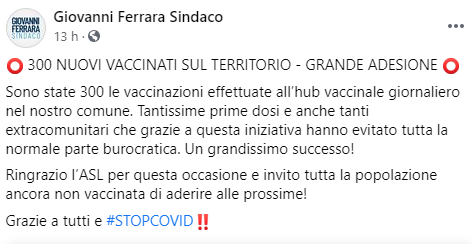Questo il post pubblicato sulla sua pagina Facebook dal Sindaco di San Felice a Cancello Giovanni Ferrara: "300 NUOVI VACCINATI SUL TERRITORIO - GRANDE ADESIONE. Sono state 300 - si legge nel post - le vaccinazioni effettuate all’hub vaccinale giornaliero nel nostro comune. Tantissime prime dosi e anche tanti extracomunitari che grazie a questa iniziativa hanno evitato tutta la normale parte burocratica. Un grandissimo successo! Ringrazio l’ASL - prosegue il post - per questa occasione e invito tutta la popolazione ancora non vaccinata di aderire alle prossime! Grazie a tutti e Stop Covid".