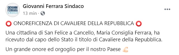 "Una cittadina di San Felice a Cancello, Maria Consiglia Ferrara, ha ricevuto dal capo dello Stato il titolo di Cavaliere della Repubblica. -Si legge nella nota- Un grande onore ed orgoglio per il nostro Paese"