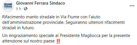 Questo il post pubblicato sulla sua pagina Facebook dal Sindaco di San Felice a Cancello Giovanni Ferrara: "Rifacimento manto stradale in Via Fiume con l’aiuto dell’amministrazione provinciale. Seguiranno - si legge nel post - ulteriori rifacimenti stradali in futuro. Un ringraziamento speciale al Presidente Magliocca per la presente attenzione sul nostro paese".