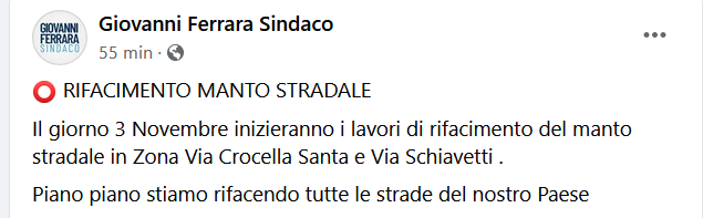 Questo il post pubblicato sulla pagina Facebook del sindaco di San Felice a Cancello, Giovanni Ferrara: "Il giorno 3 Novembre inizieranno i lavori di rifacimento del manto stradale in Zona Via Crocella Santa e Via Schiavetti. Piano piano - si legge - stiamo rifacendo tutte le strade del nostro Paese".