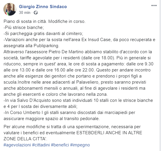 Questo il post pubblicato sulla pagina Facebook del Sindaco di San Giorgio a Cremano Giorgio Zinno: