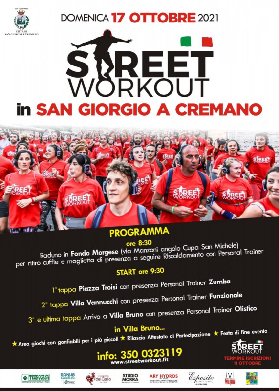 Qeuesto parte del comunicato stampa diffuso dal Comune di San Giorgio a Cremano: "Si svolgerà il 17 ottobre 2021 a San Giorgio a Cremano il primo STREET WORKOUT mai realizzato in provincia di Napoli. Un evento unico nel suo genere, rivolto a tutti, sportivi e non, che prevede una passeggiata dinamica per le strade della città - si legge nel comunicato - guidati da un team di istruttori. La particolarità di questo evento è che tutti i partecipanti saranno dotati di cuffie “wireless", attraverso cui i coach trasmetteranno musica e daranno indicazioni sullo svolgimento della attività e sui movimenti da eseguire. Si percorreranno le strade della città, tra le ville vesuviane fino al grande parco di Villa Bruno. Il circuito durerà circa due ore. Si parte alle 9.30 da via Manzoni (il raduno è previsto alle 8.30 nel Fondo Morgese, dove verranno consegnate le magliette, le cuffie e si inizierà il riscaldamento con i trainers); Lungo il tragitto - prosegue il comunicato - vi saranno tre postazioni, dove si svolgeranno attività della durata di circa un quarto d'ora di: Zumba, Funzionale e Pilates con coach professionisti. La partecipazione è totalmente gratuita ma ha posti limitati. (...) "L'evento di Street Workout - si legge ancora - finora si è si è svolto principalmente nelle grandi città - ha detto il Sindaco Giorgio Zinno. Grande successo infatti ha riscosso a Roma, Firenze Milano. D'accordo con l'assessore Maria Tarallo, abbiamo voluto portarlo anche a San Giorgio a Cremano, per continuare a promuovere lo sport sul nostro territorio e vivere in maniera diversa la nostra meravigliosa città". Dopo l'Open Day dedicato allo Sport - prosegue il comunicato - infatti che terminerà domenica 3 ottobre al Campo Paudice, l'amministrazione continua ad investire sullo sport e sulla cultura del benessere. "Inoltre - continua Zinno - in questo modo offriamo anche opportunità di socializzazione e promozione del territorio, investiamo sullo sport e guardiamo al futuro con rinnovamento e fiducia."