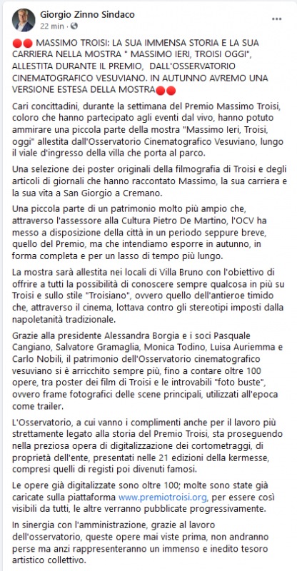 Questo il post pubblicato dal sindaco di San Giorgio a Cremano, Giorgio Zinno, sulla propria pagina Facebook: "Cari concittadini, durante la settimana del Premio Massimo Troisi, coloro che hanno partecipato agli eventi dal vivo, hanno potuto ammirare una piccola parte della mostra "Massimo Ieri, Troisi, oggi" allestita dall'Osservatorio Cinematografico Vesuviano, lungo il viale d'ingresso della villa che porta al parco. Una selezione - si legge - dei poster originali della filmografia di Troisi e degli articoli di giornali che hanno raccontato Massimo, la sua carriera e la sua vita a San Giorgio a Cremano. Una piccola parte di un patrimonio molto più ampio che, attraverso l'assessore alla Cultura Pietro De Martino, l'OCV ha messo a disposizione della città in un periodo seppure breve, quello del Premio, ma che intendiamo esporre in autunno, in forma completa e per un lasso di tempo più lungo. La mostra - ancora - sarà allestita nei locali di Villa Bruno con l'obiettivo di offrire a tutti la possibilità di conoscere sempre qualcosa in più su Troisi e sullo stile "Troisiano", ovvero quello dell'antieroe timido che, attraverso il cinema, lottava contro gli stereotipi imposti dalla napoletanità tradizionale. Grazie alla presidente Alessandra Borgia e i soci Pasquale Cangiano, Salvatore Gramaglia, Monica Todino, Luisa Auriemma e Carlo Nobili, il patrimonio dell'Osservatorio cinematografico vesuviano si è arricchito sempre più, fino a contare oltre 100 opere, tra poster dei film di Troisi e le introvabili "foto buste", ovvero frame fotografici delle scene principali, utilizzati all'epoca come trailer. L'Osservatorio - prosegue il post - a cui vanno i complimenti anche per il lavoro più strettamente legato alla storia del Premio Troisi, sta proseguendo nella preziosa opera di digitalizzazione dei cortometraggi, di proprietà dell'ente, presentati nelle 21 edizioni della kermesse, compresi quelli di registi poi divenuti famosi. Le opere già digitalizzate sono oltre 100; molte sono state già caricate sulla piattaforma CLICCA QUI, per essere così visibili da tutti, le altre verranno pubblicate progressivamente. In sinergia con l'amministrazione - conclude - grazie al lavoro dell'osservatorio, queste opere mai viste prima, non andranno perse ma anzi rappresenteranno un immenso e inedito tesoro artistico collettivo.