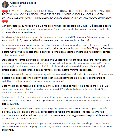 Questo il post pubblicato sulla sua pagina Facebook dal Sindaco di San Giorgio a Cremano Giorgio Zinno: "COVID-19, TORNA A SALIRE LA CURVA DEL CONTAGIO: 15 CONCITTADINI ATTUALMENTE POSITIVI, 14 NUOVI CASI NEGLI ULTIMI TRE GIORNI. IL VIRUS CIRCOLA ANCORA IN CITTA', EVITIAMO ASSEMBRAMENTI E INDOSSIAMO LA MASCHERINA PER EVITARE NUOVE LIMITAZIONI. Cari concittadini, purtroppo nelle ultime ore i numeri del contagio da Covid-19 è tornato a salire in città. Al momento - si legge nel post - i positivi risultano essere 15, un dato molto basso ma comunque triplicato rispetto alla scorsa settimana. Per darvi un'idea dell'incremento, basti infatti pensare che dal 21 giugno al 5 luglio i nuovi casi erano stati solo 3, mentre dall'ultimo weekend ne sono stati registrati ben 14. La situazione - si legge ancora nel post - resta ad oggi sotto controllo, ma è quantomai opportuna una riflessione a seguito di questo piccolo ma indicativo campanello d'allerme: anche l'anno scorso San Giorgio a Cremano è stata Covid-free in questo stesso periodo, prima della seconda ondata che ha portato i contagi a sfiorare quota mille. Stamattina - si legge ancora - ho scritto all'ufficio di Prevenzione Collettiva all'Asl affinché venissero individuate con maggiore accuratezza le cause di questo picco: dalla relazione che mi è pervenuta via Pec già nel pomeriggio risultano essere stati solo 2 i casi di cittadini di rientro dall'estero. Il virus quindi circola ancora in città, pronto ad approfittare di ogni nostra minima leggerezza. Il tracciamento - prosegue il post - dei contatti effettuati quotidianamente dai medici parla chiaramente di "numerose occasioni di aggregazione e convivialità legate all'allentamento delle misure di prevenzione collettiva e distanziamento sociale in ambito cittadino". L'età media dei contagiati - si legge ancora - è di circa 33 anni (5 di loro sono compresi nella fascia tra i 13 e i 22 anni), con una percentuale di positività schizzata dall'1,25% dell'ultima settimana al 6,40% di quella attualmente in corso. Addirittura 5 dei 15 concittadini attualmente positivi risultano vaccinati - prosegue il Sindaco - almeno con prima dose, ennesimo segnale di come l'arma la potenziale minaccia delle varianti debba sempre farci tenere alta la guardia. L'invito, pur comprendendo l'inevitabile voglia di spensieratezza soprattutto da parte dei più giovani, è quello, ora più che mai, di rispettare le regole anti contagio, indossare sempre la mascherina anche all'aperto e soprattutto di mantenere un atteggiamento responsabile evitando le occasioni di assembramento. Siamo una grande comunità - si legge ancora nel post - compiamo ancora uno sforzo in questo periodo per evitare, anche con il progredire della campagna vaccinale, di dover ottemperare a nuove limitazioni nel periodo autunnale".