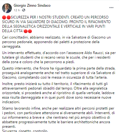 Questo il post pubblicato dal Sindaco di San Giorgio a Cremano Giorgio Zinno sulla sua pagina Facebook: "Sicurezza per i nostri studenti. Creato un percorso sicuro in Via Salvatore Di Giacomo. Pronto il rifacimento della segnaletica orizzontale e verticale in vari punti della città. Cari concittadini, abbiamo realizzato, in via Salvatore di Giacomo un percorso pedonale, apponendo dei paletti a protezione della carreggiata. Un intervento effettuato - si legge nel post - d'accordo con l'assessore Aldo Raucci, sia per tutelare gli studenti che si recano verso le scuole, che per i residenti della zona e coloro che la percorrono a piedi. Questo intervento, che finora ha riguardato la prima parte della strada, proseguirà analogamente anche nel tratto superiore di via Salvatore di Giacomo, completando così le messa in sicurezza di tutta l'arteria. Inoltre - si legge ancora nel post - presto inizierà su tutto il territorio, il rifacimento di tutti gli attraversamenti pedonali sbiaditi dal tempo. Oltre alla segnaletica orizzontale, si procederà anche al ripristino di quella verticale, laddove essa risulta danneggiata e in quei punti dove sono necessarie nuove indicazioni. Stiamo lavorando infine, anche per realizzare altri percorsi protetti per i pedoni, con particolare attenzione ai diversamente abili. Interventi- prosegue il post - di cui informeremo a breve e che rientrano nel più ampio obiettivo di abbattere progressivamente tutte le barriere architettoniche ancora presenti. Sicurezza, rispetto, controllo".