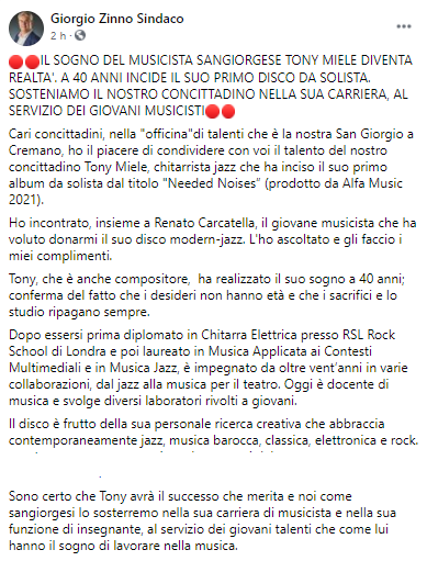 Questo parte del post pubblicato sulla sua pagina Facebook dal Sindaco di San Giorgio a Cremano Giorgio Zinno: "Il sogno del musicista sangiorgese Tony Miele diventa realtà. A 40 anni incide il suo primo disco da solista. Sosteniamo il nostro concittadino nella sua carriera, al servizio dei giovani musicisti. Cari concittadini - si legge nel post - nella "officina"di talenti che è la nostra San Giorgio a Cremano, ho il piacere di condividere con voi il talento del nostro concittadino Tony Miele, chitarrista jazz che ha inciso il suo primo album da solista dal titolo "Needed Noises” (prodotto da Alfa Music 2021). Ho incontrato - si legge ancora - insieme a Renato Carcatella, il giovane musicista che ha voluto donarmi il suo disco modern-jazz. L'ho ascoltato e gli faccio i miei complimenti. Tony - prosegue il post - che è anche compositore, ha realizzato il suo sogno a 40 anni; conferma del fatto che i desideri non hanno età e che i sacrifici e lo studio ripagano sempre. Dopo essersi prima diplomato in Chitarra Elettrica presso RSL Rock School di Londra - spiega il sindaco - e poi laureato in Musica Applicata ai Contesti Multimediali e in Musica Jazz, è impegnato da oltre vent’anni in varie collaborazioni, dal jazz alla musica per il teatro. Oggi è docente di musica e svolge diversi laboratori rivolti a giovani. Il disco - prosegue il post - è frutto della sua personale ricerca creativa che abbraccia contemporaneamente jazz, musica barocca, classica, elettronica e rock. (...). Sono certo che Tony - conclude il Sindaco - avrà il successo che merita e noi come sangiorgesi lo sosterremo nella sua carriera di musicista e nella sua funzione di insegnante, al servizio dei giovani talenti che come lui hanno il sogno di lavorare nella musica".