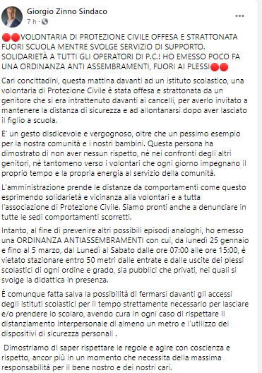 Lo apprendiamo dalla pagina Facebook del Sindaco di San Giorgio a Cremano Giorgio Zinno: "VOLONTARIA DI PROTEZIONE CIVILE OFFESA E STRATTONATA FUORI SCUOLA MENTRE SVOLGE SERVIZIO DI SUPPORTO. SOLIDARIETÀ A TUTTI GLI OPERATORI DI P.C.! HO EMESSO POCO FA UNA ORDINANZA ANTI ASSEMBRAMENTI, FUORI AI PLESSI. Cari concittadini - si legge nel post - questa mattina davanti ad un istituto scolastico, una volontaria di Protezione Civile è stata offesa e strattonata da un genitore che si era intrattenuto davanti ai cancelli, per averlo invitato a mantenere la distanza di sicurezza e ad allontanarsi dopo aver lasciato il figlio a scuola. E' un gesto disdicevole e vergognoso - continua il Sindaco - oltre che un pessimo esempio per la nostra comunità e i nostri bambini. Questa persona ha dimostrato di non aver nessun rispetto, nè nei confronti degli altri genitori, nè tantomeno verso i volontari che ogni giorno impegnano il proprio tempo e la propria energia al servizio della comunità. L'amministrazione prende le distanze - si legge ancora nel post - da comportamenti come questo esprimendo solidarietà e vicinanza alla volontari e a tutta l'associazione di Protezione Civile. Siamo pronti anche a denunciare in tutte le sedi comportamenti scorretti. Intanto, al fine di prevenire altri possibili episodi analoghi, ho emesso una ORDINANZA ANTIASSEMBRAMENTI con cui, da lunedì 25 gennaio e fino al 5 marzo - prosegue al sabato - dal Lunedì al Sabato dalle ore 07:00 alle ore 15:00, è vietato stazionare entro 50 metri dalle entrate e dalle uscite dei plessi scolastici di ogni ordine e grado, sia pubblici che privati, nei quali si svolge la didattica in presenza. È comunque fatta salva la possibilità di fermarsi davanti gli accessi degli istituti scolastici per il tempo strettamente necessario per lasciare e/o prendere lo scolaro, avendo cura in ogni caso di rispettare il distanziamento interpersonale di almeno un metro e l’utilizzo dei dispositivi di sicurezza personali. Dimostriamo - prosegue il post - di saper rispettare le regole e agire con coscienza e rispetto, ancor più in un momento che necessita della massima responsabilità per il bene nostro e dei nostri cari"