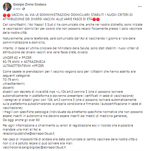 Questo il post pubblicato dal Sindaco di San Giorgio a Cremano Giorgio Zinno sulla sua pagina Facebook:" Vaccini, al via le somministrazioni domiciliari; stabiliti i nuovi criteri di attribuzione dei diversi vaccini alle fasce d'età. Cari concittadini, l'Asl Napoli 3 Sud ci ha comunicato che, anche nel nostro distretto, sono iniziate le vaccinazioni domiciliari per coloro che non possono recarsi fisicamente presso il polo vaccinale della nostra città. Naturalmente - si legge nel post - previa telefonata, sarà comunicato dall’Asl al vaccinando il giorno e l'ora della somministrazione a domicilio. Intanto, in base all'ultima circolare del Ministero della Salute, sono stati stabiliti i nuovi criteri di attribuzione dei diversi vaccini alle varie fasce d'età, ovvero: Under 60 = Pfizer, 60-79 anni = Astrazeneca, Ultraottantenni = Pfizer. Come sapete - prosegue il post - le prenotazioni per il vaccino valgono solo per i cittadini che hanno aderito alle seguenti categorie: 70-79 anni; ultraottantenni; docenti; disabili con decreto di invalidità Inps +L.104 art.3 comma 3 (che si possono iscrivere automaticamente in piattaforma e dovranno presentare i certificati in sede di vaccinazione); I caregiver di disabili gravi - continua il post - con 104, art.3 comma 3 (che si possono iscrivere automaticamente sulla piattaforma autodichiarando la propria condizione e firmando l'autocertificazione in sede di vaccinazione);ì I fragili con specifiche patologie (individuate da altrettanto specifiche normative che non possono essere inseriti in autonomia ma devono essere inseriti dai medici di medicina generale). Da oggi anche gli over 60. Per ogni informazione - si legge nel post - o chiarimento su errori di registrazione ecc vi ricordo che è possibile mandare una mail all’Asl a: 'relazionipubbliche@aslnapoli3sud.it' Nel caso di impossibilità di andare alla data comunicata al centro vaccinale della nostra città o non ci si è potuto recare si può scrivere - conclude il post - alla mail: 'vaccinocovid[email protected]".