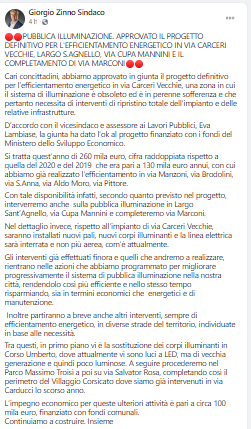Questo il post pubblicato sulla sua pagina Facebook dal Sindaco di San Giorgio a Cremano Giorgio Zinno: "Pubblica illuminazione. Approvato il progetto definitivo per l'efficientamento energetico in Via Carceri Vecchie, Largo S. Agnello, Via Cupa Mannini e il completamento di Via Marconi. Cari concittadini - si legge nel post - abbiamo approvato in giunta il progetto definitivo per l’efficientamento energetico in via Carceri Vecchie, una zona in cui il sistema di illuminazione è obsoleto ed è in perenne sofferenza e che pertanto necessita di interventi di ripristino totale dell'impianto e delle relative infrastrutture. D’accordo con il vicesindaco - prosegue il post - e assessore ai Lavori Pubblici, Eva Lambiase, la giunta ha dato l'ok al progetto finanziato con i fondi del Ministero dello Sviluppo Economico. Si tratta quest'anno di 260 mila euro, cifra raddoppiata rispetto a quella del 2020 e del 2019 che era pari a 130 mila euro annui, con cui abbiamo già realizzato l'efficientamento in via Manzoni, via Brodolini, via S.Anna, via Aldo Moro, via Pittore. Con tale disponibilità infatti, secondo quanto previsto nel progetto, interverremo anche sulla pubblica illuminazione in Largo Sant’Agnello, via Cupa Mannini e completeremo via Marconi. Nel dettaglio - si legge ancora - invece, rispetto all'impianto di via Carceri Vecchie, saranno installati nuovi pali, nuovi corpi illuminanti e la linea elettrica sarà interrata e non più aerea, com'è attualmente. Gli interventi già effettuati finora e quelli che andremo a realizzare, rientrano nelle azioni che abbiamo programmato per migliorare - prosegue il post - progressivamente il sistema di pubblica illuminazione nella nostra città, rendendolo così più efficiente e nello stesso tempo risparmiando, sia in termini economici che energetici e di manutenzione. Inoltre partiranno a breve anche altri interventi, sempre di efficientamento energetico, in diverse strade del territorio, individuate in base alle necessità. Tra questi - si legge ancora nel post - in primo piano vi è la sostituzione dei corpi illuminanti in Corso Umberto, dove attualmente vi sono luci a LED, ma di vecchia generazione e quindi poco luminose. A seguire procederemo nel Parco Massimo Troisi a poi su via Salvator Rosa, completando così il perimetro del Villaggio Corsicato dove siamo già intervenuti in via Carducci lo scorso anno. L'impegno economico - conclude il post - per queste ulteriori attività è pari a circa 100 mila euro, finanziato con fondi comunali. Continuiamo a costruire. Insieme".