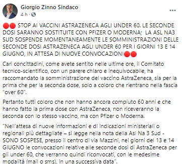 Questo il post pubblicato sulla sua pagina Facebook dal Sindaco di San Giorgio a Cremano Giorgio Zinno: "STOP AI VACCINI ASTRAZENECA AGLI UNDER 60. LE SECONDE DOSI SARANNO SOSTITUITE CON PFIZER O MODERNA; LA ASL NA3 SUD SOSPENDE MOMENTANEAMENTE LE SOMMINISTRAZIONI DELLE SECONDE DOSI ASTRAZENECA AGLI UNDER 60 PER I GIORNI 13 E 14 GIUGNO, IN ATTESA DI NUOVE CONVOCAZIONI. Cari concittadini - si legge nel post - come avete sentito nelle ultime ore, il Comitato tecnico-scientifico, con un parere chiaro e inequivocabile, ha raccomandato la somministrazione del vaccino AstraZeneca, sia per la prima che per la seconda dose, solo a coloro che rientrano nella fascia “over 60”. Pertanto tutti coloro che non hanno ancora compiuto 60 anni e che hanno fatto la prima dose con AstraZeneca - prosegue il post - non riceveranno la seconda con lo stesso vaccino, ma con Pfizer o Moderna. “Nell’attesa di nuove informazioni e di indicazioni ministeriali o regionali più dettagliate – si legge nella nota della Asl Na 3 Sud - SONO SOSPESE, presso il centro di via Mazzini, nei giorni del 13 e 14 GIUGNO le convocazioni relative alle seconde dosi di AstraZeneca per gli under 60, che verranno quindi riconvocati, con le medesime modalità - conclude il post - (mail o sms), in una successiva data”.