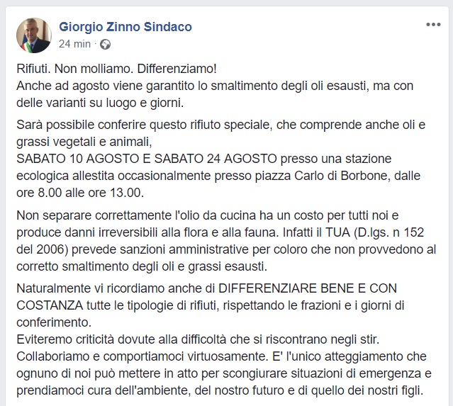 Questo quanto apprendiamo dal profilo FB del Sindaco Giorgio Zinno