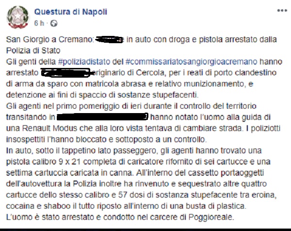 Questo il post pubblicato sulla pagina fb ufficiale della Questura di Napoli