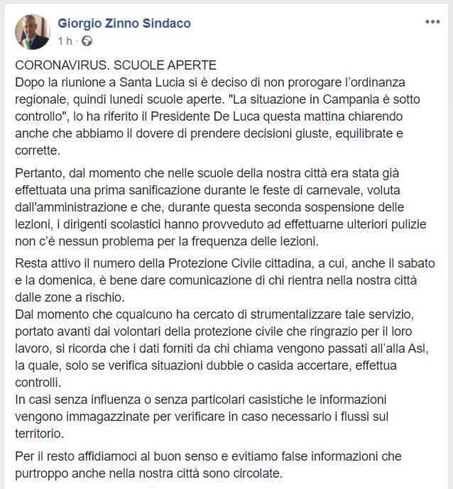 Questo quanto comunicato dal Sindaco di San Giorgio a Cremano, Giorgio Zinno
