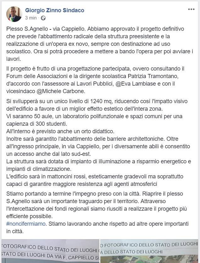 Il Sindaco di San Giorgio a Cremano, Giorgio Zinno, ha annunciato che presto sarà presentato il bando per i lavori presso il plesso S.Agnello. Questo è quanto apprendiamo dal profilo Facebook