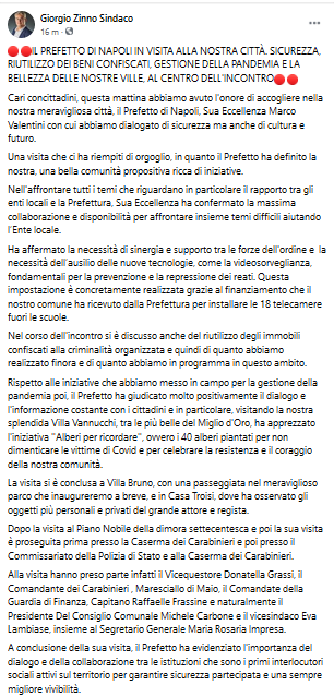 Questo il post pubblicato sulla pagina Facebook del sindaco di San Giorgio a Cremano Giorgio Zinno: "Cari concittadini, questa mattina abbiamo avuto l'onore di accogliere nella nostra meravigliosa città, il Prefetto di Napoli, Sua Eccellenza Marco Valentini con cui abbiamo dialogato di sicurezza ma anche di cultura e futuro. Una visita - si legge nel post - che ci ha riempiti di orgoglio, in quanto il Prefetto ha definito la nostra, una bella comunità propositiva ricca di iniziative. Nell'affrontare tutti i temi che riguardano in particolare il rapporto tra gli enti locali e la Prefettura, Sua Eccellenza ha confermato la massima collaborazione e disponibilità per affrontare insieme temi difficili aiutando l’Ente locale. Ha affermato - prosegue il post - la necessità di sinergia e supporto tra le forze dell'ordine e la necessità dell’ausilio delle nuove tecnologie, come la videosorveglianza, fondamentali per la prevenzione e la repressione dei reati. Questa impostazione è concretamente realizzata grazie al finanziamento che il nostro comune ha ricevuto dalla Prefettura per installare le 18 telecamere fuori le scuole. Nel corso dell'incontro - si legge ancora nel post- si è discusso anche del riutilizzo degli immobili confiscati alla criminalità organizzata e quindi di quanto abbiamo realizzato finora e di quanto abbiamo in programma in questo ambito. Rispetto alle iniziative che abbiamo messo in campo per la gestione della pandemia poi - prosegue il post - il Prefetto ha giudicato molto positivamente il dialogo e l'informazione costante con i cittadini e in particolare, visitando la nostra splendida Villa Vannucchi, tra le più belle del Miglio d'Oro, ha apprezzato l'iniziativa "Alberi per ricordare", ovvero i 40 alberi piantati per non dimenticare le vittime di Covid e per celebrare la resistenza e il coraggio della nostra comunità. La visita - prosegue ancora il post - si è conclusa a Villa Bruno, con una passeggiata nel meraviglioso parco che inaugureremo a breve, e in Casa Troisi, dove ha osservato gli oggetti più personali e privati del grande attore e regista. Dopo la visita al Piano Nobile della dimora settecentesca e poi la sua visita è proseguita prima presso la Caserma dei Carabinieri e poi presso il Commissariato della Polizia di Stato e alla Caserma dei Carabinieri. Alla visita - recita ancora il post - hanno preso parte infatti il Vicequestore Donatella Grassi, il Comandante dei Carabinieri, Maresciallo di Maio, il Comandate della Guardia di Finanza, Capitano Raffaelle Frassine e naturalmente il Presidente Del Consiglio Comunale Michele Carbone e il vicesindaco Eva Lambiase, insieme al Segretario Generale Maria Rosaria Impresa. A conclusione della sua visita - conclude il post - il Prefetto ha evidenziato l'importanza del dialogo e della collaborazione tra le istituzioni che sono i primi interlocutori sociali attivi sul territorio per garantire sicurezza partecipata e una sempre migliore vivibilità".