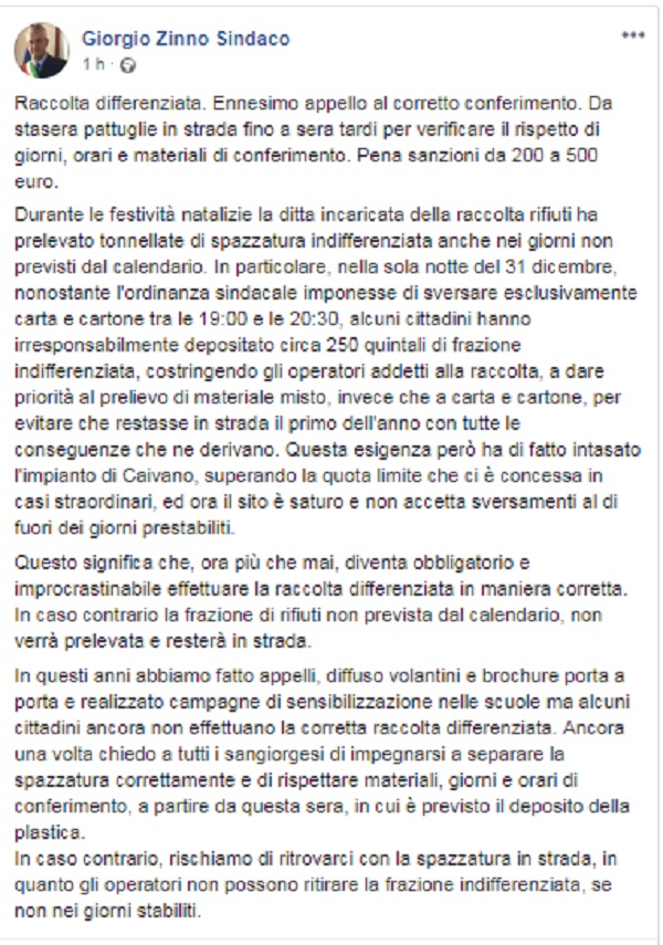 Questo il post pubblicato sulla pagina fb ufficiale del Sindaco di San Giorgio A Cremano Giorgio Zinno