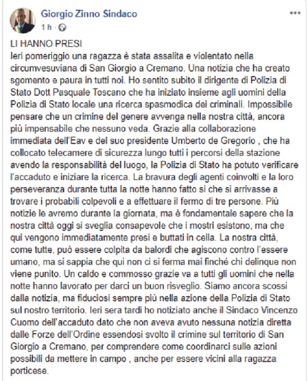 Questo il post pubblicato sulla pagina fb ufficiale del Sindaco di San Giorgio a Cremano Giorgio Zinno.