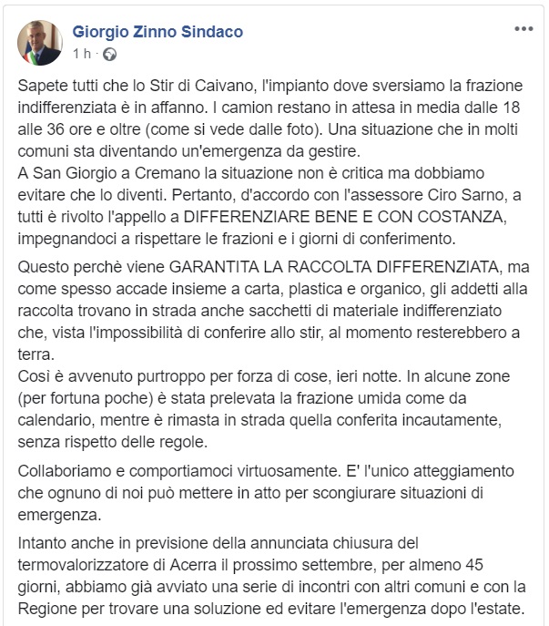 SAN GIORGIO A CREMANO. Rifiuti. Zinno: "Comportiamoci virtuosamente per scongiurare emergenze..."