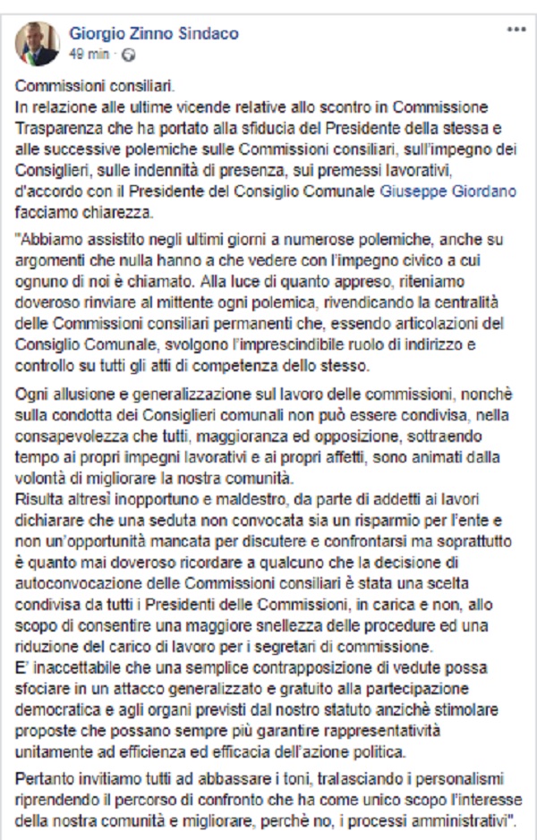 Questo il post pubblicato sulla pagina fb ufficiale del Sindaco di San Giorgio a Cremano Giorgio Zinno.