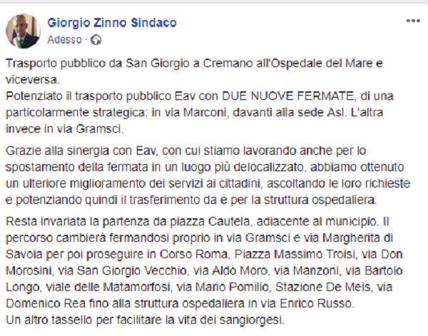 Questo il post pubblicato sulla bacheca fb ufficiale del Sindaco di San Giorgio a Cremano Giorgio Zinno.