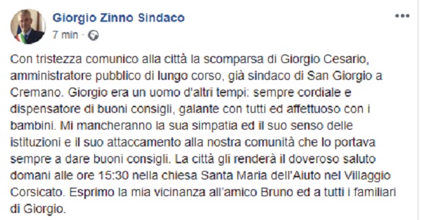 Questo io post pubblicato sulla pagina fb ufficiale del Sindaco di San Giorgio a Cremano Giorgio Zinno.
