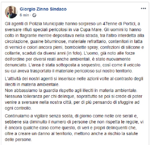 Questo il post pubblicato sulla pagina fb ufficlale del Sindaco di San Giorgio a Cremano Giorgio Zinno.
