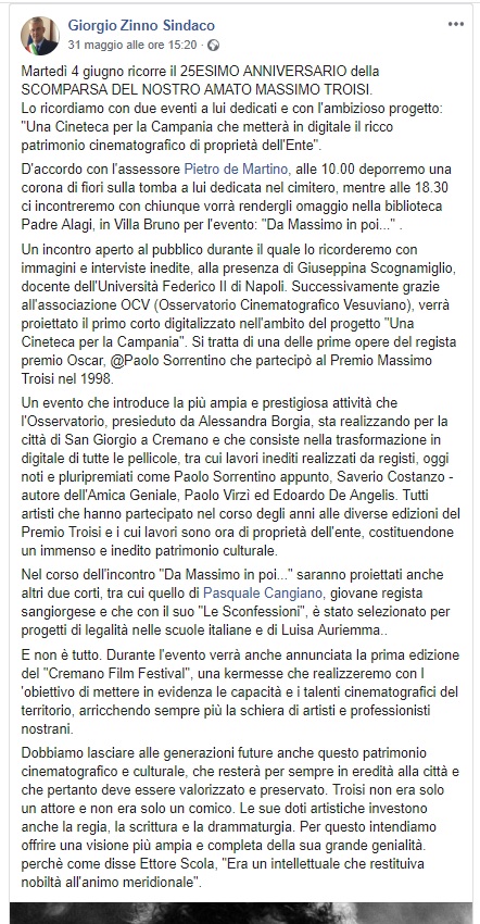 In occasione dell'anniversario della sua scomparsa, il Comune di San Giorgio a Cremano ricorda così Massimo Troisi