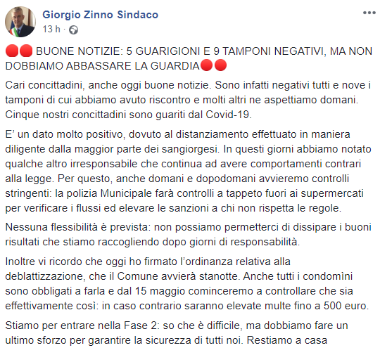 Questo il post pubblicato ieri sera sulla pagina Facebook del Sindaco di San Giorgio a Cremano Giorgio Zinno: