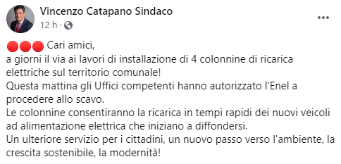 a giorni il via ai lavori di installazione di 4 colonnine di ricarica elettriche sul territorio comunale! Questa mattina - si legge nel post - gli Uffici competenti hanno autorizzato l'Enel a procedere allo scavo. Le colonnine consentiranno la ricarica in tempi rapidi dei nuovi veicoli ad alimentazione elettrica che iniziano a diffondersi. Un ulteriore servizio per i cittadini - conclude il post - un nuovo passo verso l'ambiente, la crescita sostenibile, la modernità!".