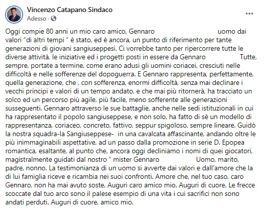 Dalla pagina Facebook del Sindaco di San Giuseppe Vesuviano Vincenzo Catapano, gli auguri all'ex allenatore della Sangiuseppese calcio Gennaro Ambrosio.