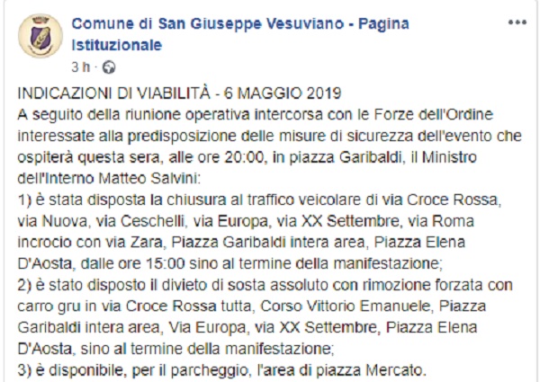 Questo il post pubblicato sulla pagina fb ufficiale del Comune di San Giuseppe Vesuviano.