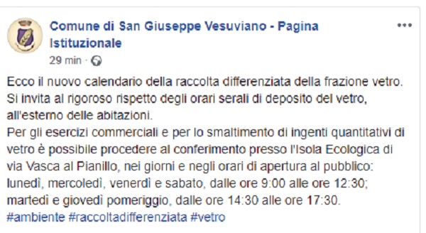 Questo il post pubblicato sulla pagina fb ufficiale del Comune di San Giuseppe Vesuviano.