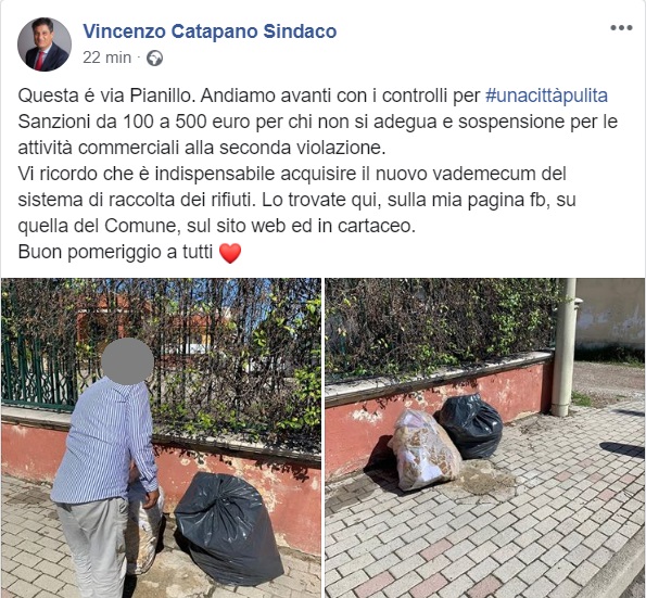 Questo quanto pubblicato sulla pagina facebook del Sindaco Catapano