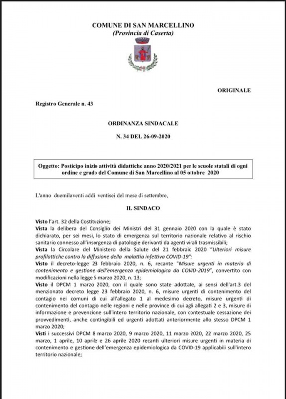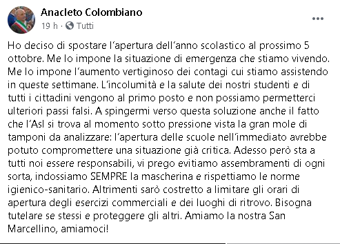Lo apprendiamo dalla bacheca Facebook del Sindaco di San Marcellino, Anacleto Colombiano.