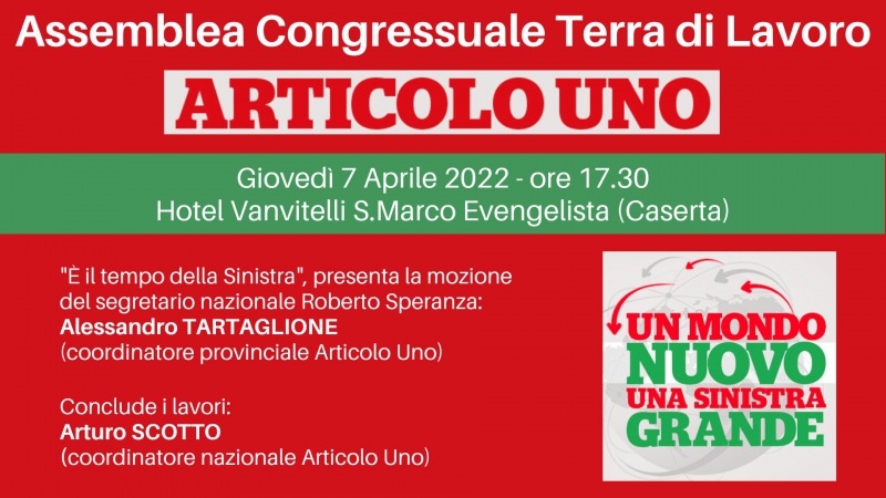 Questo il comunicato stampa diffuso da 'Articolo Uno Caserta': "Giovedì 7 Aprile 2022, alle ore 17.30, presso l'Hotel Vanvitelli di San Marco Evangelista (Caserta), si terrà l'assemblea provinciale per il congresso di Articolo Uno Caserta. Sarà il coordinatore provinciale Alessandro Tartaglione a presentare la mozione del segretario nazionale, nonché Ministro della Salute, Roberto Speranza dal titolo "E' tempo della sinistra". "Partecipa - si legge nel comunicato - ai lavori il coordinatore nazionale del partito Arturo Scotto. L'assemblea dovrà discutere e votare il documento politico ed eleggere i delegati al congresso regionale. Un momento importante per il partito della sinistra casertana in previsione del congresso nazionale di Articolo Uno - si legge ancora - che si svolgerà a Roma il 23 e 24 aprile 2022. "Si tratta - spiega il segretario Tartaglione - di un momento di straordinaria importanza per il partito in vista delle elezioni politiche del 2023 prima di tutto, ma anche di una tornata importante di elezioni amministrative che ci vedrà impegnati nei prossimi mesi in diversi Comuni della nostra provincia. Siamo impegnati a riorganizzare e rafforzare, insieme - prosegue il comunicato - alle altre forze del centrosinistra, il fronte progressista, provinciale, regionale e nazionale, in un momento storico cruciale". Sono stati invitati a partecipare all'assemblea anche i rappresentati politici - conclude il comunicato - ed istituzionali provinciali dell'area progressista".