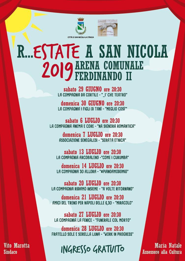 Riportiamo la locandina degli eventi che si terrano a San Nicola la strada all'interno del programma culturale "R...estate a San Nicola 2019". Le varie performance teatrali avranno luogo all'arena comunale Ferdinando II e saranno ad ingresso gratuito.