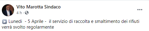Questo il post pubblicato dal Sindaco di San Nicola la Strada Vito Marotta sulla sua pagina Facebook: "Lunedi - 5 Aprile - il servizio di raccolta e smaltimento dei rifiuti verrà svolto regolarmente".