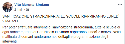 Questo il post pubblicato sulla pagina Facebook del Sindaco di San Nicola La Strada Vito Marotta: