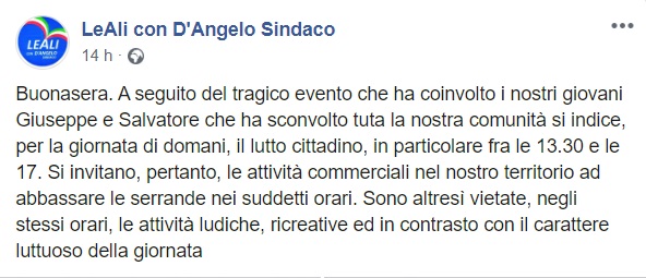 Questo quanto pubblicato sulla pagina facebook LeAli con D'Angelo Sindaco: