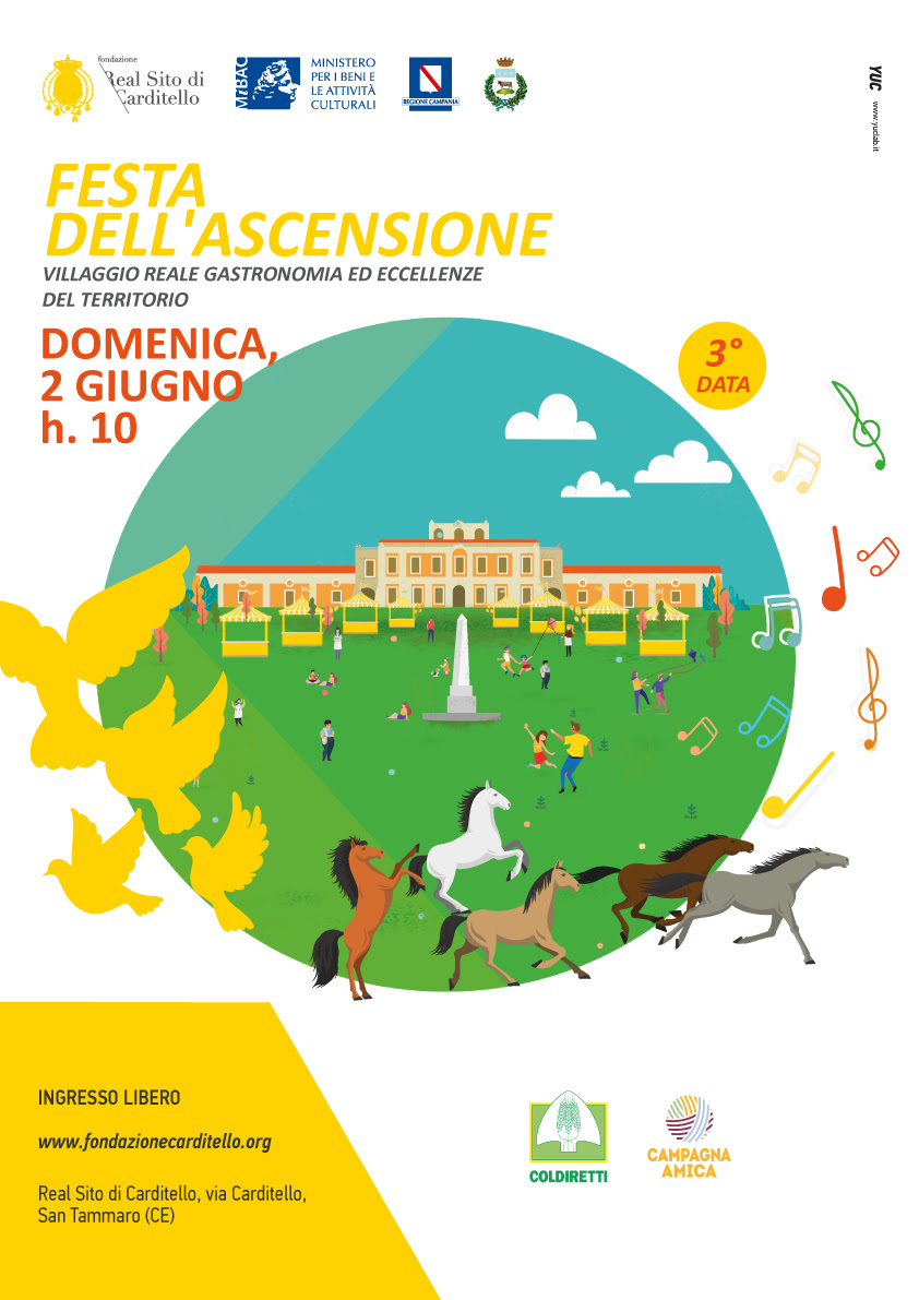 "Anche quest’anno la Fondazione Real Sito di Carditello propone la Festa dell’Ascensione, iniziativa giunta alla terza edizione, ideata per recuperare la tradizionale manifestazione pubblica promossa a Carditello dai Borbone. Si legge nel comunicato. La Festa sarà introdotta alle ore 10 dai Saluti istituzionali del Presidente Luigi Nicolais, cui seguirà alle 11.30 la Santa Messa, celebrata nella Chiesa dell’Ascensione da Don Francesco Marotta. In questa occasione sarà eccezionalmente riportata al Sito borbonico la pala d’altare di Carlo Brunelli, - si legge nel comunicato - originariamente collocata sull’altare e oggi custodita alla Reggia di Caserta.