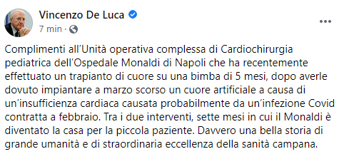 Questo il post pubblicato sulla sua pagina Facebook dal Presidente della Regione Campania Vincenzo De Luca: "Complimenti all’Unità operativa complessa di Cardiochirurgia pediatrica dell’Ospedale Monaldi di Napoli che ha recentemente - si legge nel post - effettuato un trapianto di cuore su una bimba di 5 mesi, dopo averle dovuto impiantare a marzo scorso un cuore artificiale a causa di un’insufficienza cardiaca causata probabilmente da un’infezione Covid contratta a febbraio. Tra i due interventi, sette mesi in cui il Monaldi è diventato la casa per la piccola paziente. Davvero una bella storia - conclude il post - di grande umanità e di straordinaria eccellenza della sanità campana".