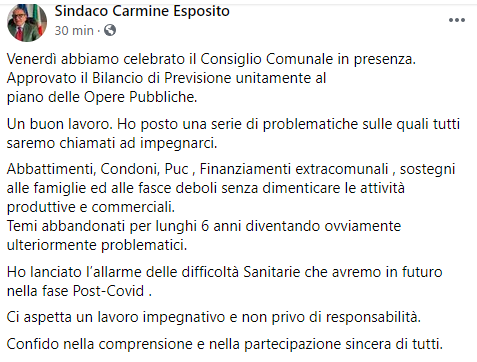 Questo il post pubblicato dal Sindaco di Sant'Anastasia Carmine Esposito sulla sua pagina Facebokk: "Venerdì abbiamo celebrato il Consiglio Comunale in presenza. Approvato il Bilancio di Previsione - si legge nel post - unitamente al piano delle Opere Pubbliche.