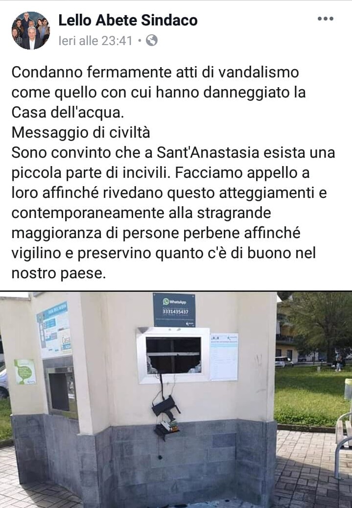 Questo il commento del Sindaco di Sant'Anastasia Lello Abete riguardo all'episodio vandalico accaduto nella notte.