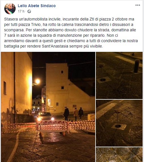 Brutto episodio di inciviltà a Sant'Anastasia. Questo il messaggio del Sindaco Lello Abete.